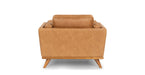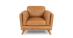 An oak wooden trim and voluptuous leather cushions define this chair with an updated mid-century modern style. Sink into the feather filled cushions and relax — you've come home to your new favorite place. Each hide used for upholstery is as unique as a fingerprint. Natural color variations, wrinkles and creases are part of the unique characteristics of genuine leather.